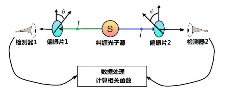 愛(ài)因斯坦構(gòu)想了一個(gè)思想實(shí)驗(yàn),描述了一個(gè)不穩(wěn)定的大粒子衰變成兩個(gè)小粒子(A和B)的情況:大粒子分裂成兩個(gè)同樣的小粒子。小粒子獲得動(dòng)能,分別向相反的兩個(gè)方向飛出去。如果粒子A的自旋為上,粒子B的自旋便一定是下,才能保持總體的自旋守恒,反之亦然。根據(jù)量子力學(xué)的說(shuō)法,測(cè)量前兩個(gè)粒子應(yīng)該處于疊加態(tài),比如“A上B下”和“A下B上”各占一定概率的疊加態(tài)(例如,概率各為50%)。然后,我們對(duì)A進(jìn)行測(cè)量,A的狀態(tài)便在一瞬間坍縮了,如果A的狀態(tài)坍縮為上,因?yàn)槭睾愕木壒?,B的狀態(tài)就一定為下。但是,假如A和B之間已經(jīng)相隔非常遙遠(yuǎn),比如說(shuō)幾萬(wàn)光年,按照量子力學(xué)的理論,B也應(yīng)該是上下各一半的概率,為什么它能夠在A坍縮的那一瞬間,做到總是選擇下呢?難道A和B之間有某種方式及時(shí)地“互通消息”?即使假設(shè)它們能夠互相感知,它們之間傳遞的信號(hào)需要在一瞬間跨越幾萬(wàn)光年,這個(gè)傳遞速度已經(jīng)超過(guò)了光速,而這種超距作用又是現(xiàn)有的物理知識(shí)不容許的。于是,愛(ài)因斯坦認(rèn)為:這就構(gòu)成了佯謬。愛(ài)因斯坦強(qiáng)調(diào)不可能有超距作用,意味著他堅(jiān)持經(jīng)典理論的“局域性”。量子力學(xué)已經(jīng)否定了確定性,這是愛(ài)因斯坦不認(rèn)可的。而現(xiàn)在,如果連局域性都要拋棄,這可是愛(ài)因斯坦絕對(duì)不能同意的,因而在文章中他將兩個(gè)粒子間瞬時(shí)的相互作用稱為“幽靈般的超距作用”。薛定諤讀完EPR論文之后,他用德文寫(xiě)了一封信給愛(ài)因斯坦,在這封信里,他最先使用了術(shù)語(yǔ)Verschr?nkung(意思是糾纏),這是為了要形容在EPR思想實(shí)驗(yàn)里,兩個(gè)暫時(shí)耦合的粒子,不再耦合之后彼此之間仍舊維持的關(guān)聯(lián)。EPR佯謬也得到了玻爾的回應(yīng)。他認(rèn)為,因?yàn)閮蓚€(gè)粒子形成了一個(gè)互相糾纏的整體,只有用波函數(shù)描述的整體才有意義,不能將它們視為相隔甚遠(yuǎn)的兩個(gè)個(gè)體——既然是協(xié)調(diào)相關(guān)的一體,它們之間便無(wú)須傳遞什么信息。愛(ài)因斯坦絕對(duì)接受不了玻爾的這種古怪的說(shuō)法,即使在之后的二三十年中,玻爾的理論占了上風(fēng),量子理論如日中天,各個(gè)分支高速發(fā)展,給人類(lèi)社會(huì)帶來(lái)偉大的技術(shù)革命,愛(ài)因斯坦仍然固執(zhí)地堅(jiān)持他的經(jīng)典信念,反對(duì)哥本哈根學(xué)派對(duì)量子理論的詮釋。1955年,愛(ài)因斯坦與世長(zhǎng)辭,幾年后玻爾也離開(kāi)了人世。但他們觀點(diǎn)的分歧依然沒(méi)有一個(gè)定論,直到1964年英國(guó)物理學(xué)家約翰·貝爾提出了著名的“貝爾不等式”。愛(ài)因斯坦一方堅(jiān)持認(rèn)為量子糾纏的隨機(jī)性是表面現(xiàn)象,背后可能藏有“隱變量”,貝爾本人也支持這個(gè)觀點(diǎn)。他試圖用實(shí)驗(yàn)來(lái)證明愛(ài)因斯坦的隱變量觀點(diǎn)是正確的。貝爾假設(shè)了一個(gè)上圖所示的實(shí)驗(yàn)。根據(jù)出生確定論,這些光子的偏振方向都是已經(jīng)確定好了的,對(duì)一個(gè)光子的測(cè)量結(jié)果和對(duì)另一個(gè)光子的測(cè)量結(jié)果無(wú)關(guān)。但在量子力學(xué)中,對(duì)一個(gè)光子的測(cè)量結(jié)果必然影響另一個(gè)光子的測(cè)量結(jié)果。比如做4次實(shí)驗(yàn),分別把左右兩邊的偏振片置于(0°, 0°)、(30°, 0°)、(0°, -30°)、(30°, -30°)的角度。第一種情況,所有的光子都能通過(guò)偏振片。第二、三種情況,是分別選擇每一邊的偏振片。第四種情況,是兩邊的偏振片都旋轉(zhuǎn)。簡(jiǎn)單來(lái)說(shuō),如果對(duì)一個(gè)光子的測(cè)量結(jié)果和對(duì)另一個(gè)光子的測(cè)量結(jié)果無(wú)關(guān),那么兩邊的偏振片都旋轉(zhuǎn)的結(jié)果≤每一邊偏振片分別旋轉(zhuǎn)的結(jié)果之和,這就是貝爾不等式。但根據(jù)量子理論,對(duì)一個(gè)光子的測(cè)量結(jié)果必然影響另一個(gè)光子的測(cè)量結(jié)果。那么,就會(huì)出現(xiàn)兩邊的偏振片都旋轉(zhuǎn)的結(jié)果>每一邊偏振片分別旋轉(zhuǎn)的結(jié)果之和的情況。也就是說(shuō),如果該不等式成立,愛(ài)因斯坦獲勝,如果該不等式不成立,則玻爾獲勝。因此,貝爾不等式將愛(ài)因斯坦等人提出的EPR佯謬中的思想實(shí)驗(yàn),轉(zhuǎn)化為真實(shí)可行的物理實(shí)驗(yàn)。盡管貝爾的原意是支持愛(ài)因斯坦,找出量子系統(tǒng)中的隱變量,但他的不等式導(dǎo)致的實(shí)驗(yàn)結(jié)果卻適得其反。在之后的幾十年里,所有貝爾測(cè)試的實(shí)驗(yàn)結(jié)果都偏向于量子力學(xué)。1972年,物理學(xué)家克勞澤及其合作者弗里德曼,成為貝爾不等式實(shí)驗(yàn)驗(yàn)證的第一人。實(shí)驗(yàn)結(jié)果違背貝爾不等式,證明了量子力學(xué)的正確性。1982年,巴黎第十一大學(xué)的阿蘭·阿斯佩等人在貝爾的幫助下,改進(jìn)了克勞澤和弗里德曼的貝爾定理實(shí)驗(yàn),成功地堵住了部分主要漏洞。這次的實(shí)驗(yàn)結(jié)果同樣違反貝爾不等式,證明了量子力學(xué)的非局域性。