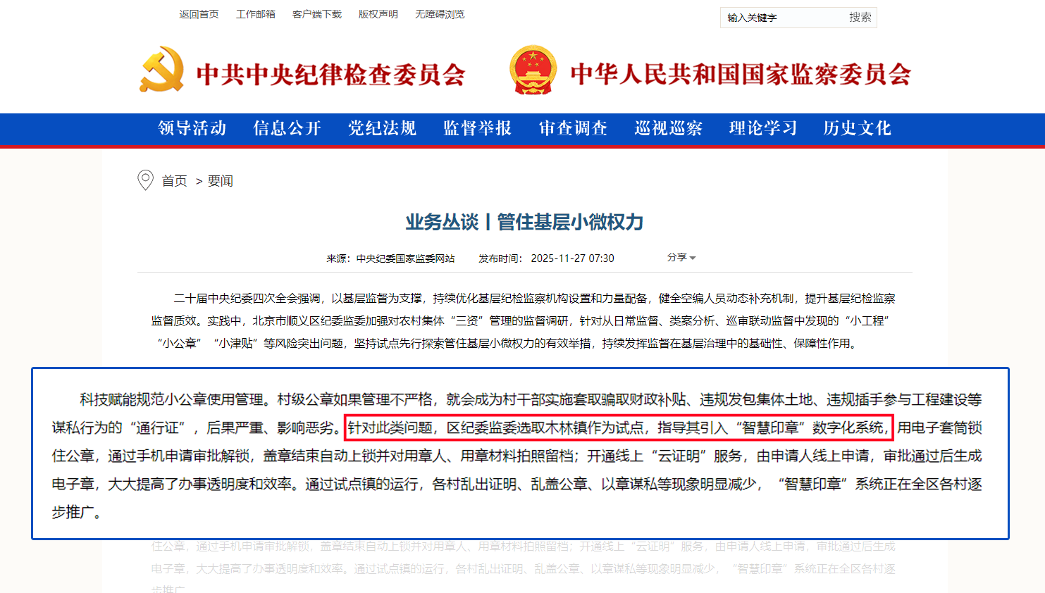 業(yè)務(wù)叢談丨管住基層小微權(quán)力摘要:村級公章如果管理不嚴(yán)格,就會成為村干部實(shí)施套取騙取財政補(bǔ)貼、違規(guī)發(fā)包集體土地、違規(guī)插手參與工程建設(shè)等謀私行為的“通行證”,后果嚴(yán)重、影響惡劣。針對此類問題,區(qū)紀(jì)委監(jiān)委選取木林鎮(zhèn)作為試點(diǎn),指導(dǎo)其引入“智慧印章”數(shù)字化系統(tǒng)。近日,中央紀(jì)委國家監(jiān)委網(wǎng)站在《業(yè)務(wù)…